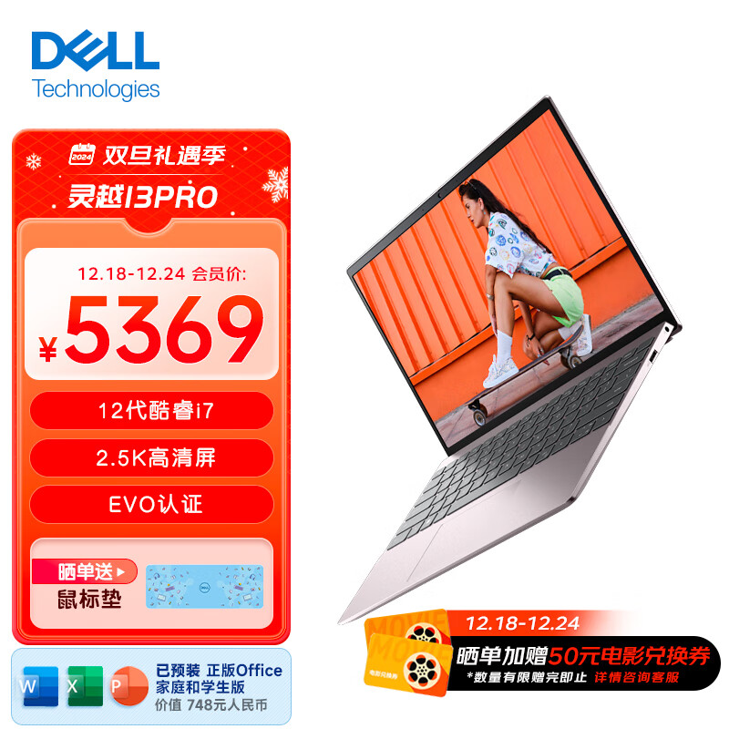 戴尔(DELL) 13pro灵越5320 13.3英寸EVO颜值女生轻薄商务笔记本电脑高色域高清屏 i7-1260P/16G/512G/2.5K/粉价格:5399.00元!