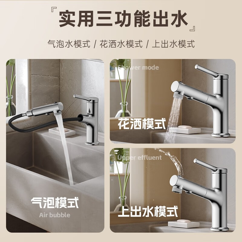 浪鲸(SSWW) 多功能抽拉式面盆冷热水龙头单孔拉伸水龙头 洁面漱口三功能抽拉【铬色】价格:349.00元!