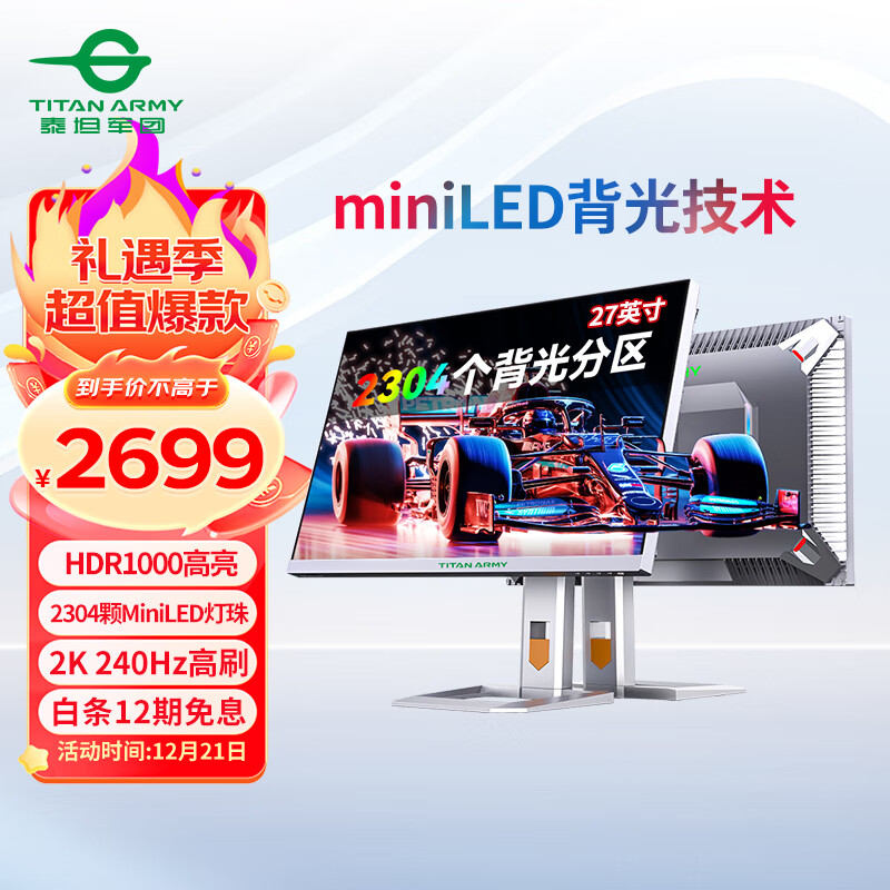 泰坦军团 27英寸 miniLED 2K 240Hz HDR1000 FAST IPS Type-C 90W 升降旋转 内置音箱电竞电脑显示器P27A6S价格:3499.00元!