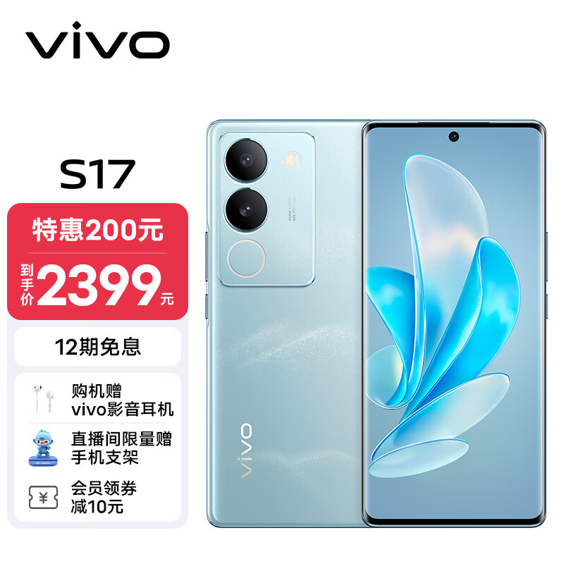vivo S17 12GB+256GB 山海青 前置5000万广角柔光 后置智慧柔光环 1.5K超视网膜屏 5G 快充 拍照 手机价格:2399.00元!
