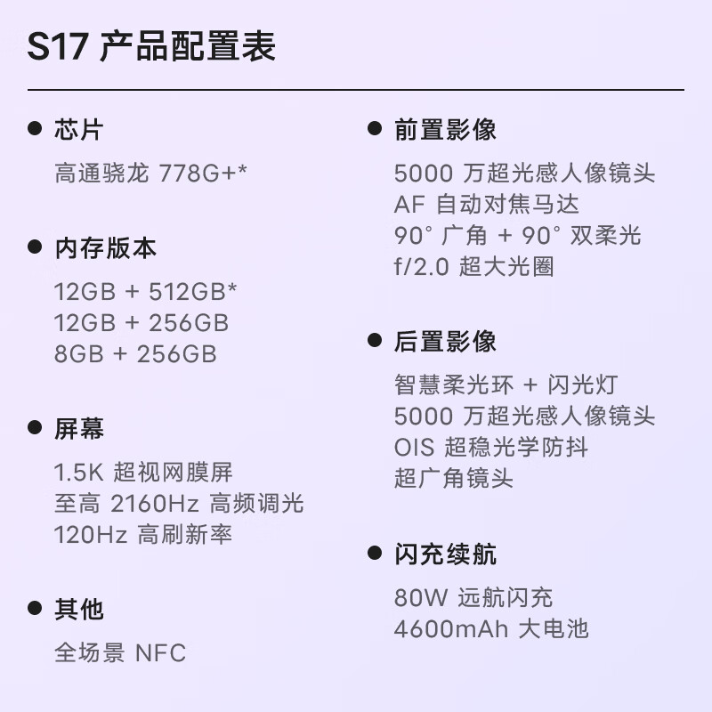来问我vivoS17很喜欢这个外观,质量挺好的,配色很喜欢,性能也比较好特别喜欢拍照效果:效果特别好运行速度:特别快待机时间:还没有使用,具体时间还不得而知屏幕音效:特别好