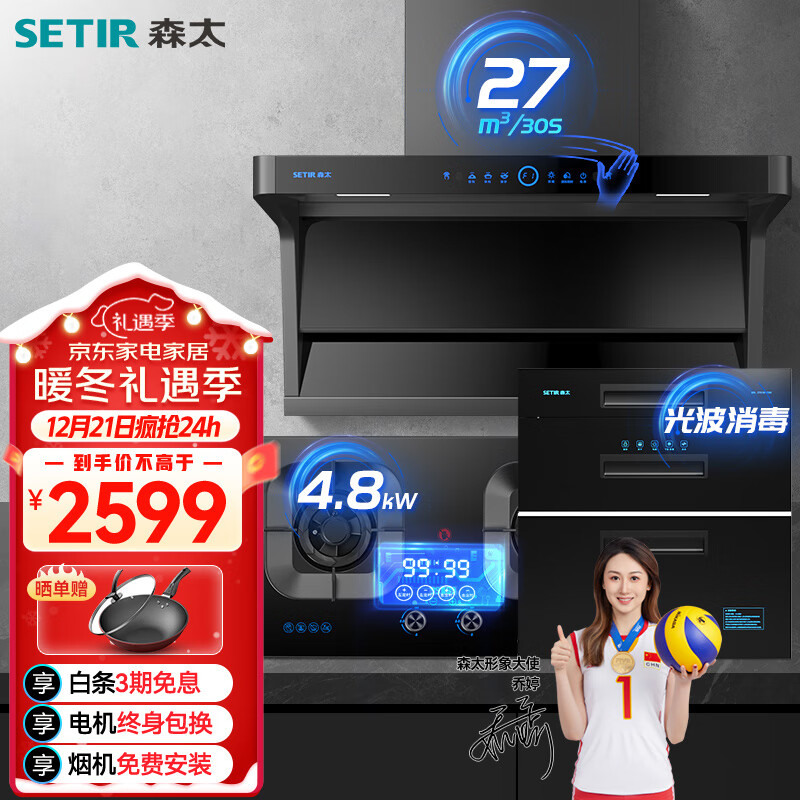 森太(SETIR)抽油烟机套装小户型尺寸顶侧双吸油烟机鸳鸯定时燃气灶消毒柜厨房三件套B822+TM81+F260 液化气价格:2899.00元!