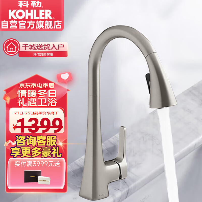 2、双十一活动价果断下手买科勒KOHLER龙头厨房龙头高抛单把冷热水龙头厨房龙头水槽龙头洗菜盆龙头K-21368T-4-CP,性价比很高,很实惠,使用起来感觉很好,非常完美.值得推荐。