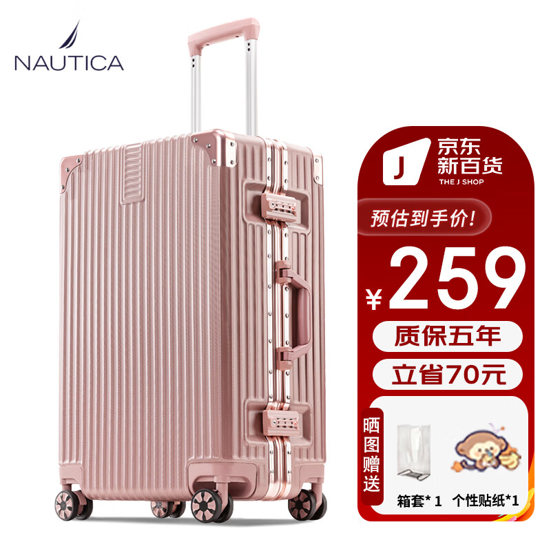 NAUTICA铝框行李箱万向轮拉杆箱女26英寸大容量旅行箱学生玫瑰金密码箱价格:329.00元!