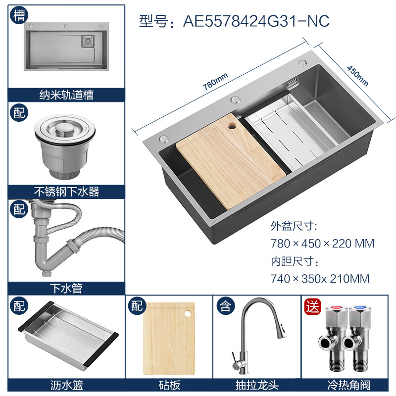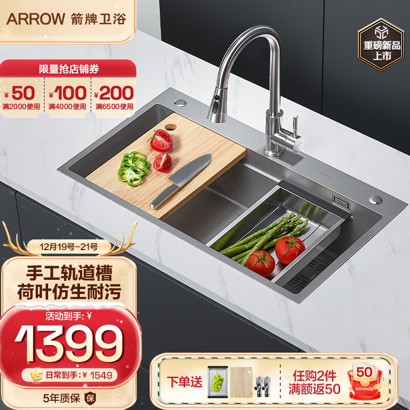 箭牌(ARROW)304不锈钢水槽纳米轨道大单槽厨房洗菜盆台上台下洗碗一体盆 78银色纳米轨道槽-含抽拉龙头价格:1599.00元!