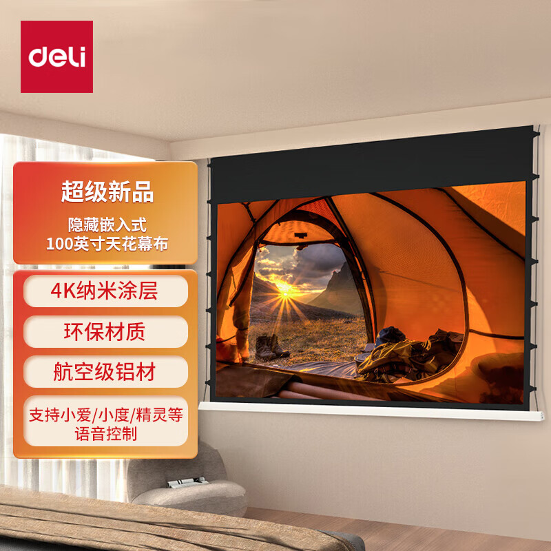 得力(deli)嵌入式投影幕布4K软白100英寸16:9隐藏式天花幕布 智能语音控制 APP控制电动拉线幕布MS901价格:2899.00元!