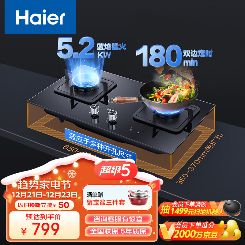 海尔(Haier)燃气灶天然气 家用双灶具5.2kW瞬燃猛火 180min智能定时 以旧换新搭配可调节底壳Q2BE7(12T)价格:799.00元!
