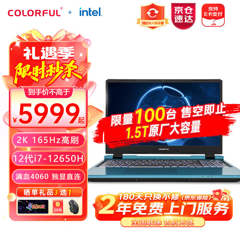 七彩虹(Colorful)隐星P15 15.6英寸40系列显卡游戏本电竞笔记本电脑学生设计剪辑 独显直连4050/4060 i7-12650H+RTX4060 16G/512G固态 苍珀蓝价格:6149.00元!