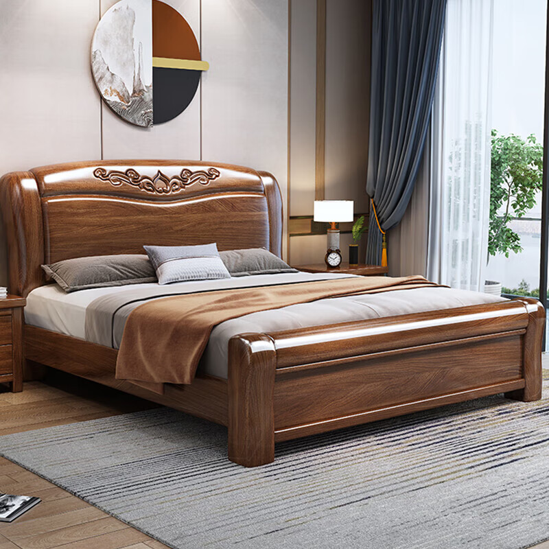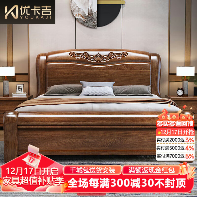 优卡吉胡桃木新中式实木床主卧双人床储物床MJ-6696# 1.8米框架床+床垫价格:2699.00元!
