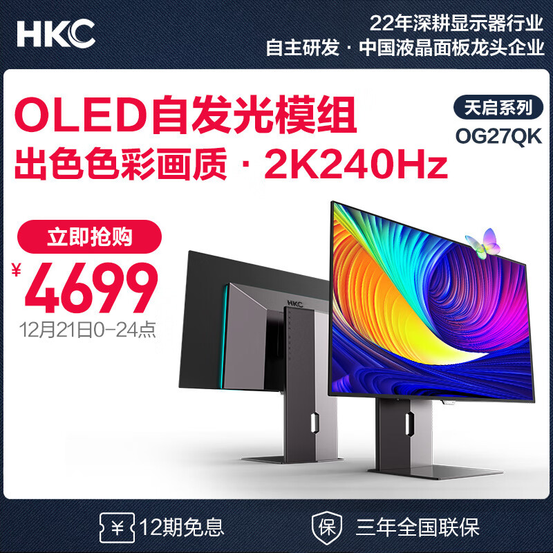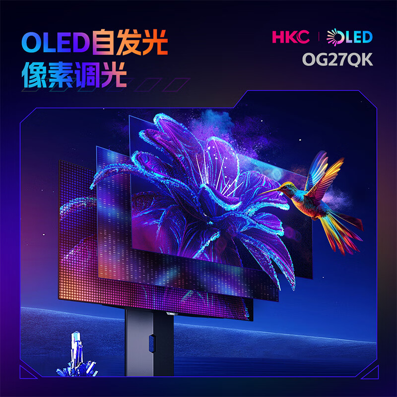 HKC 26.5英寸 OLED 2K 240Hz 0.03ms响应 原生10bit Type-C90W 电竞游戏 防眩光屏幕旋转升降显示器 OG27QK价格:5999.00元!