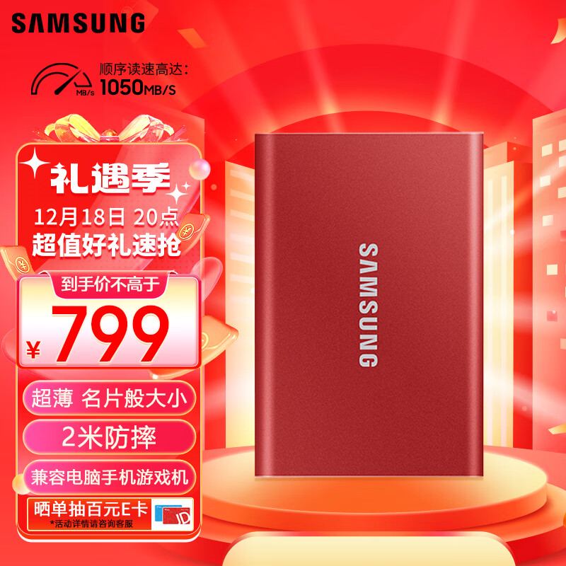 三星(SAMSUNG) 1TB Type-c USB 3.2 移动固态硬盘(PSSD) T7 红色 NVMe传输速度1050MB/s 超薄时尚价格:799.00元!