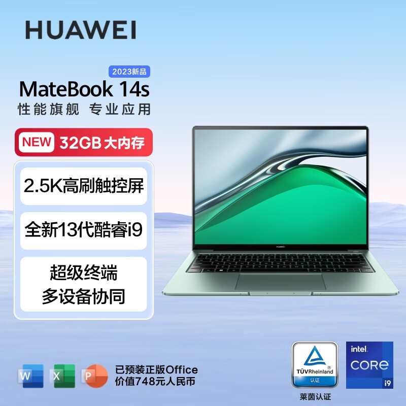 华为(HUAWEI)笔记本电脑MateBook 14s 2023 英特尔Evo 13代酷睿标压i9 32G 1T 14.2英寸120Hz触控/轻薄本/手机互联 云杉绿价格:9199.00元!