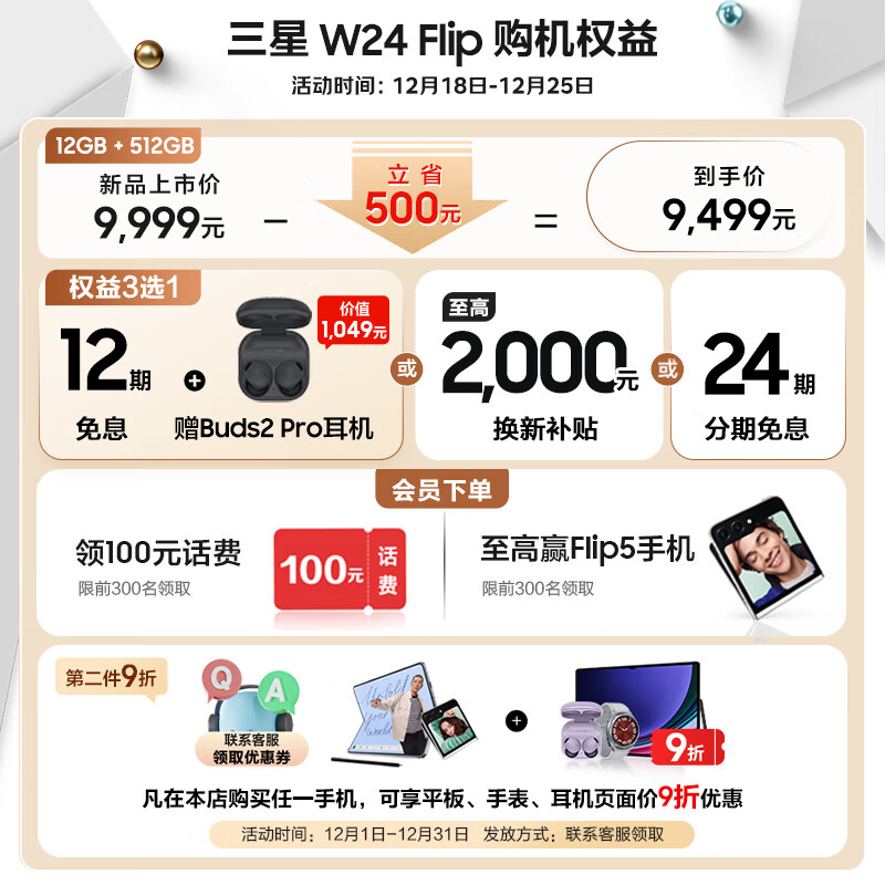 三星 SAMSUNG W24 Flip 12GB+512GB 冰瓷白 大视野智能外屏 掌心折叠 立式自由拍摄 5G折叠屏手机价格:9999.00元!