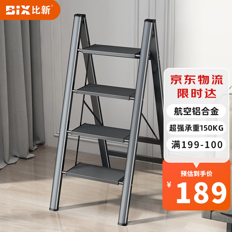 比新(BIX)家用梯子铝合金人字梯四步加厚折叠梯装修工程梯BX-T1101-B价格:289.00元!