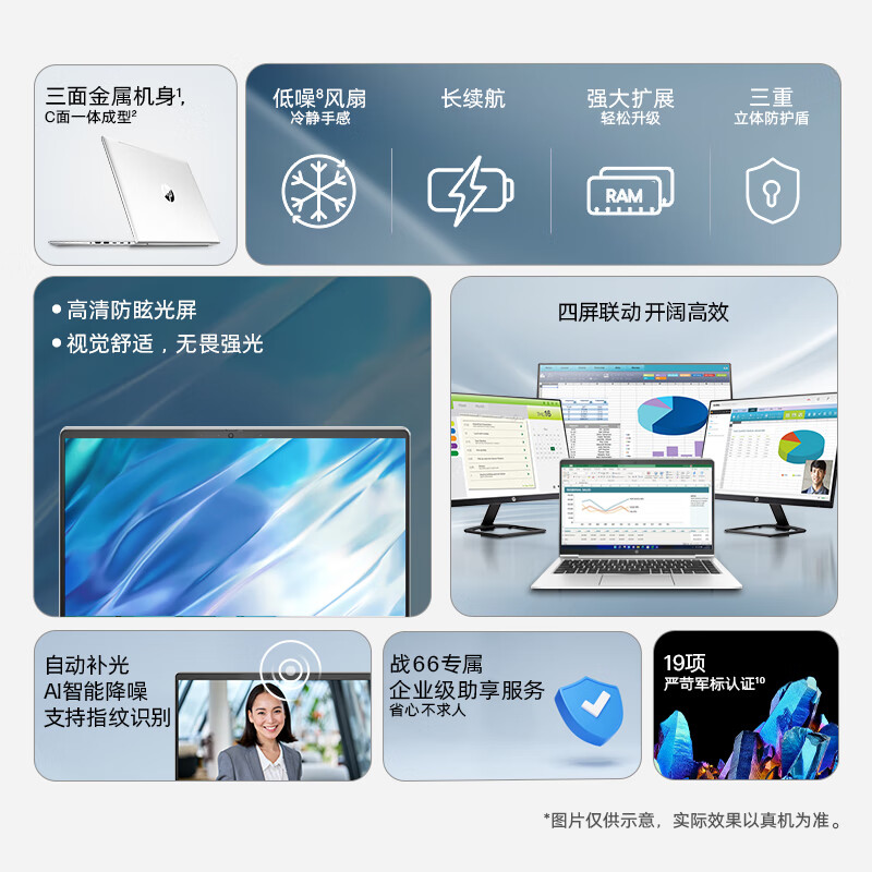 4、运输很给力,双壳保护,双重保障机身漂亮,银色非常好看初始设置也不麻烦,配备了人脸识别和指纹识别,多种密保模式,键盘手感也很舒适电池盒非常小巧,充电线长度非常好,使用时充电也挺便捷注册的时候还可以领取惠普的办公软件会员,很棒机身不会容易发烫,散热不错轻薄程度也可以的,整个机子拿在手上不觉得沉惠普youaresogood