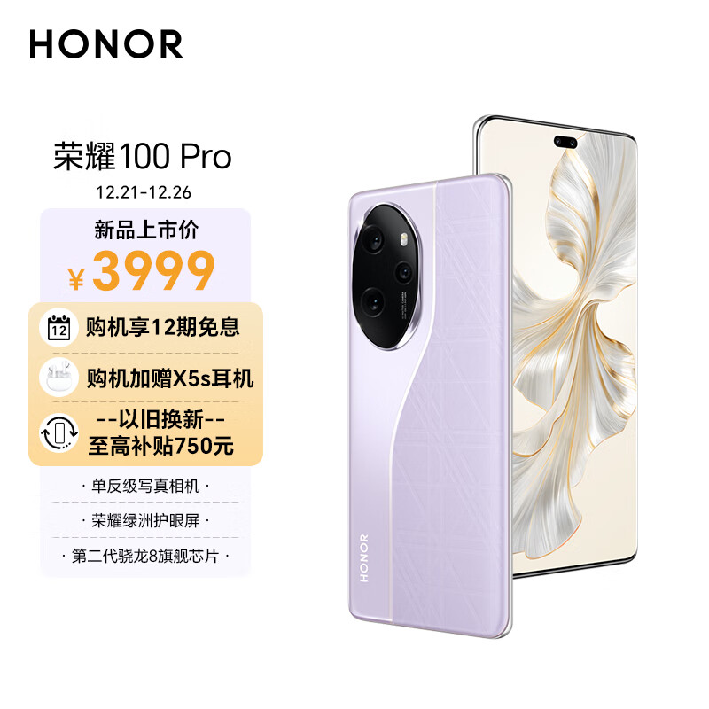 荣耀100 Pro 单反级写真相机 荣耀绿洲护眼屏 第二代骁龙8旗舰芯片 16GB+512GB 莫奈紫 5G价格:3999.00元!