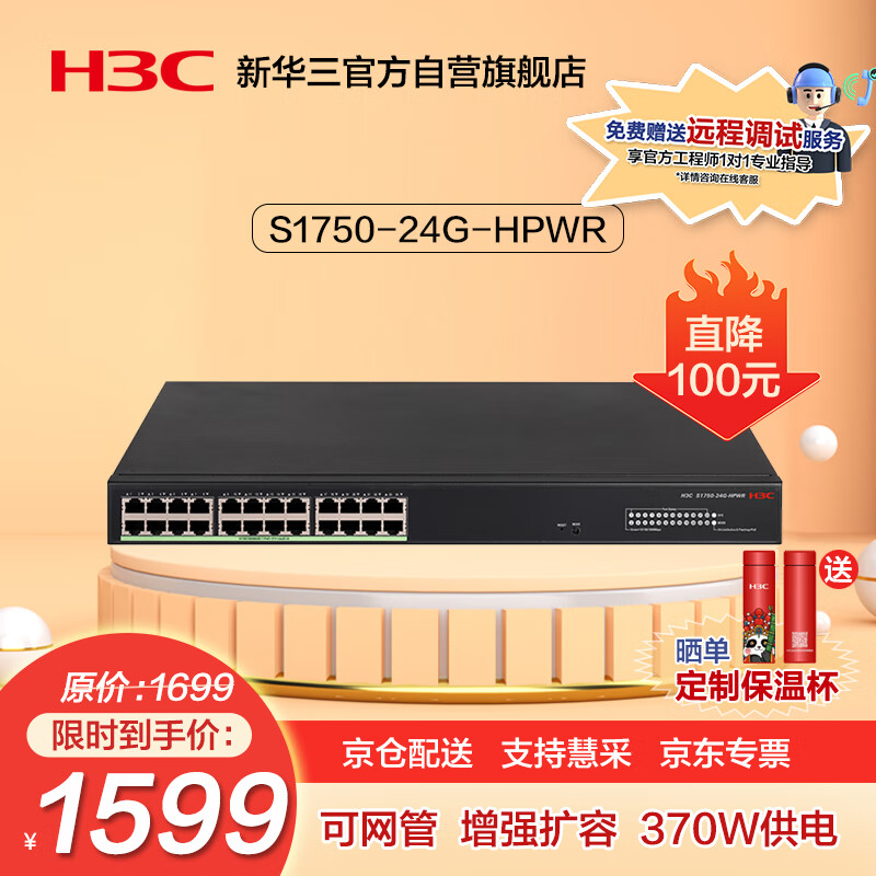 新华三(H3C)24口千兆POE供电网络监控交换机 Web轻管理/POE370W S1750-24G-HPWR价格:1599.00元!