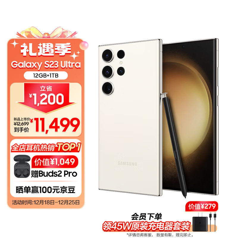 三星 SAMSUNG Galaxy S23 Ultra 2亿像素 第二代骁龙8移动平台 大屏S Pen书写 12GB+1TB 悠柔白 5G游戏手机价格:11499.00元!