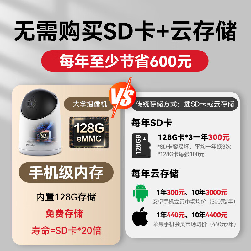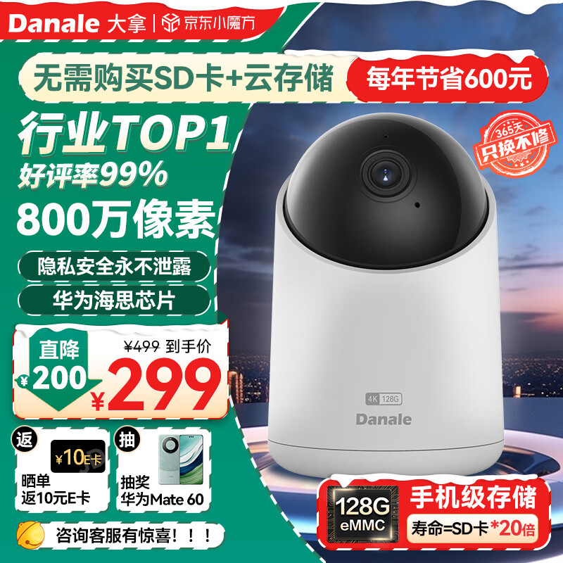 大拿4K摄像机 家用摄像头 手机远程360度监控器(800万像素 128GB存储 隐私 视频创作助手)价格:499.00元!