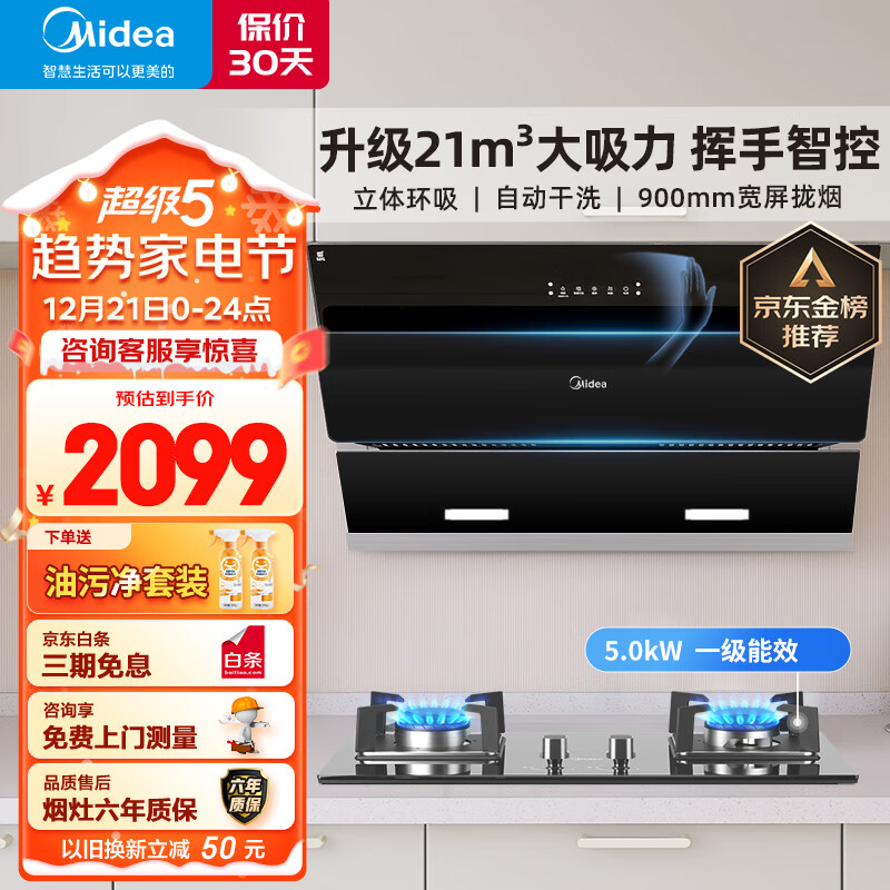 美的(Midea)抽油烟机燃气灶套装小户型厨房烟灶套装 21大吸力自动清洗油烟机灶具套装J25S+Q330液化气价格:2099.00元!