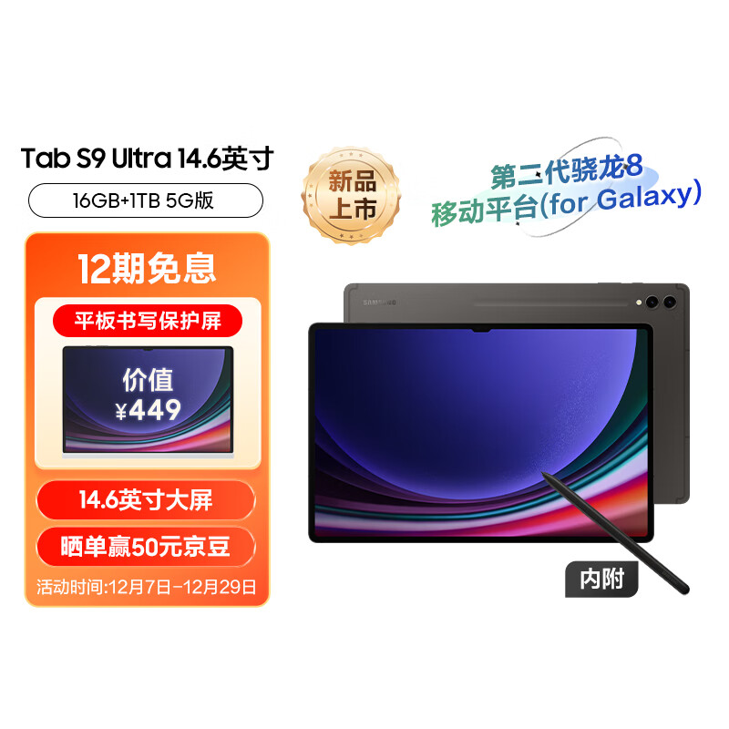 三星(SAMSUNG)平板电脑2023款Tab S9 Ultra 14.6英寸16G+1TB 5G 骁龙8Gen2 顺滑全视屏 内附Spen 云影灰价格:13899.00元!