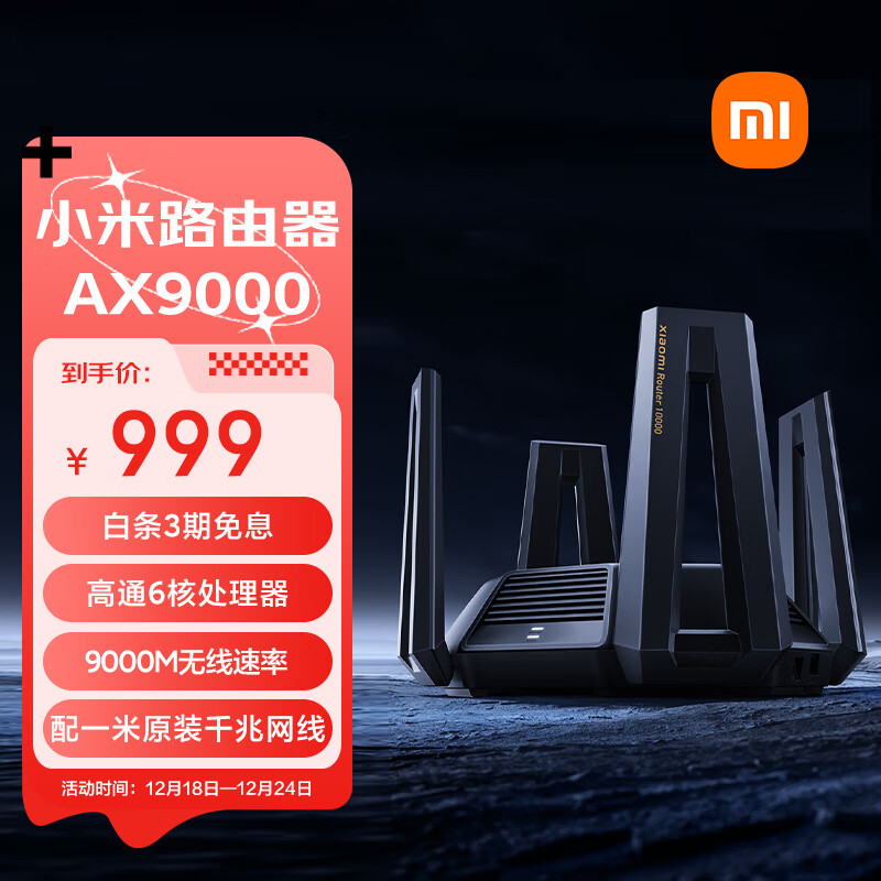 小米(MI)路由器 AX9000 5G双频WIFI6 高通6核处理器 9000M速率 无线穿墙千兆 家用智能 电竞路由价格:999.00元!