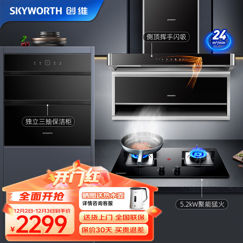 创维(Skyworth)抽油烟机7字型 顶侧双吸油烟机厨房烟灶消三件套24立方油烟机灶具消毒柜套装Y7K+Z50BS+X20A天然气价格:2299.00元!