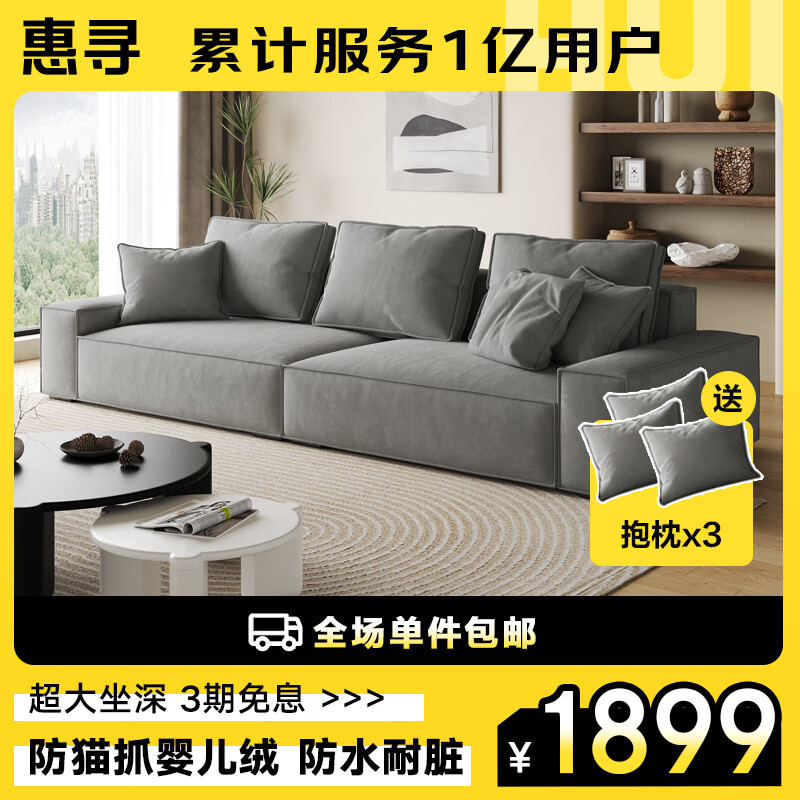 惠寻 京东自有品牌 婴儿绒豆腐块科技布艺沙发直排四人位2.8米价格:1929.00元!