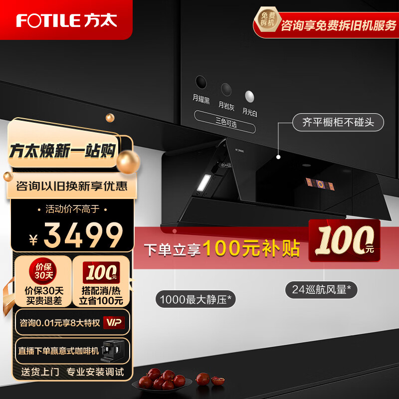 方太(FOTILE)抽吸油烟机 侧吸式家用厨房油烟机 24巡航风量 挥手智控 方太新月系列 月耀黑 01-F1A价格:3499.00元!