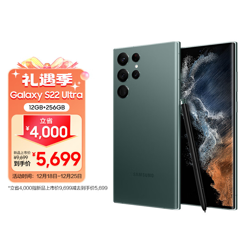 三星 SAMSUNG Galaxy S22 Ultra 超视觉夜拍系统 超耐用精工设计 大屏S Pen书写 12GB+256GB 雾松绿 5G手机价格:5699.00元!