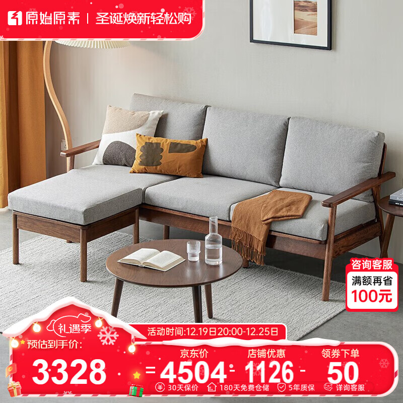 原始原素实木沙发北欧橡木冬夏两用现代简约沙发黑胡桃色灰色三人位+脚踏价格:4504.00元!