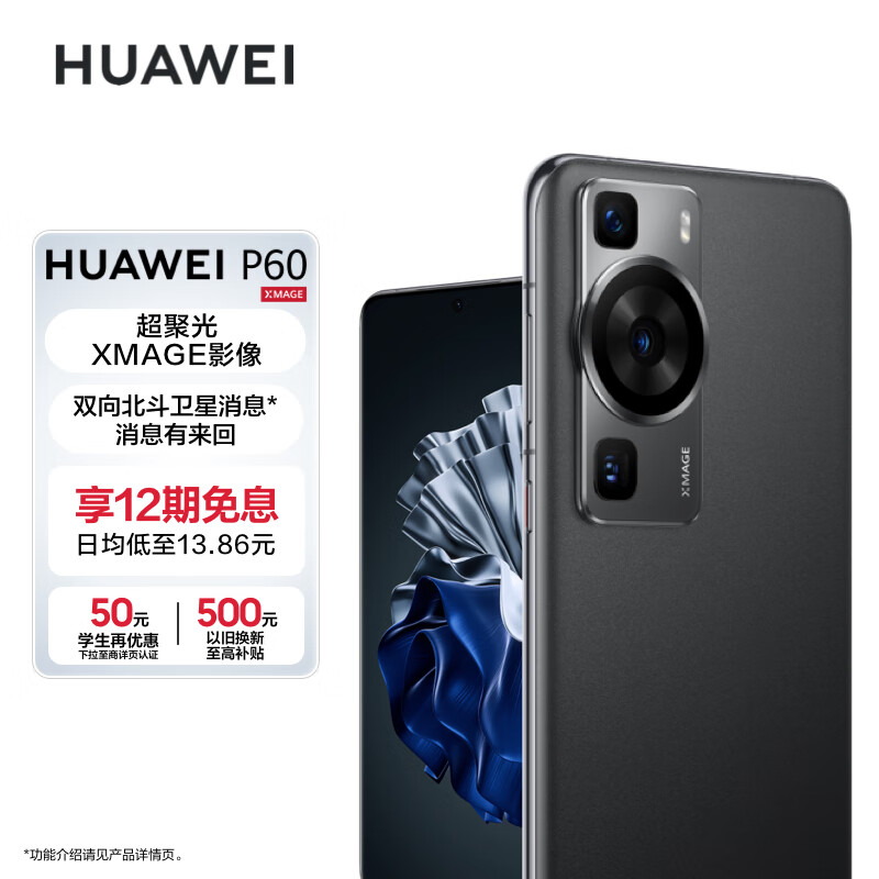 华为/HUAWEI P60 超聚光XMAGE影像 双向北斗卫星消息 256GB 羽砂黑 鸿蒙曲面屏 智能旗舰手机价格:4888.00元!
