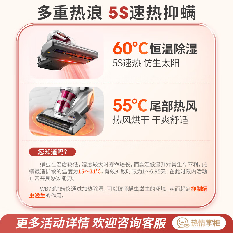 1、吸力强劲,吸的时候停留时间长点的话,床铺感到微微热,拍打功能不是很明显,很弱,吸扫面比吸尘器配的吸床的头要宽,吸扫床铺效率高些。