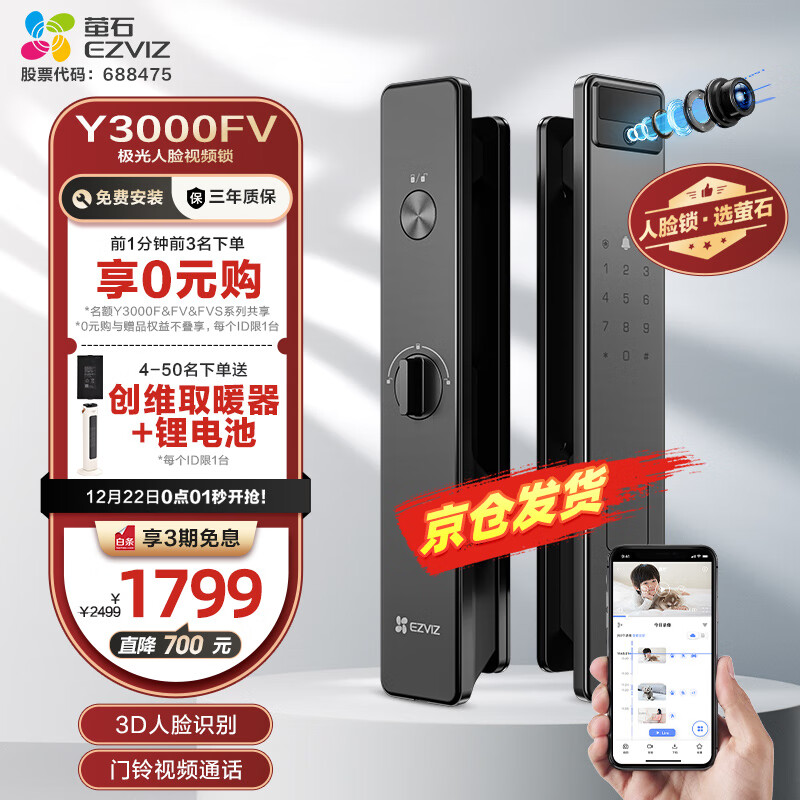 萤石Y3000FV智能锁 灰 3D人脸识别无需指纹 家用全自动猫眼门铃视频锁密码锁 防盗智能电子门锁价格:1799.00元!