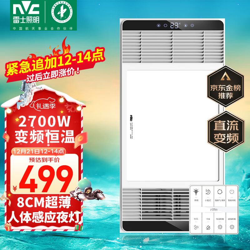 雷士(NVC)智能变频超薄极简浴霸浴室暖风照明排气一体电暖器卫生间集成吊顶价格:686.00元!