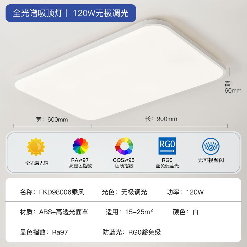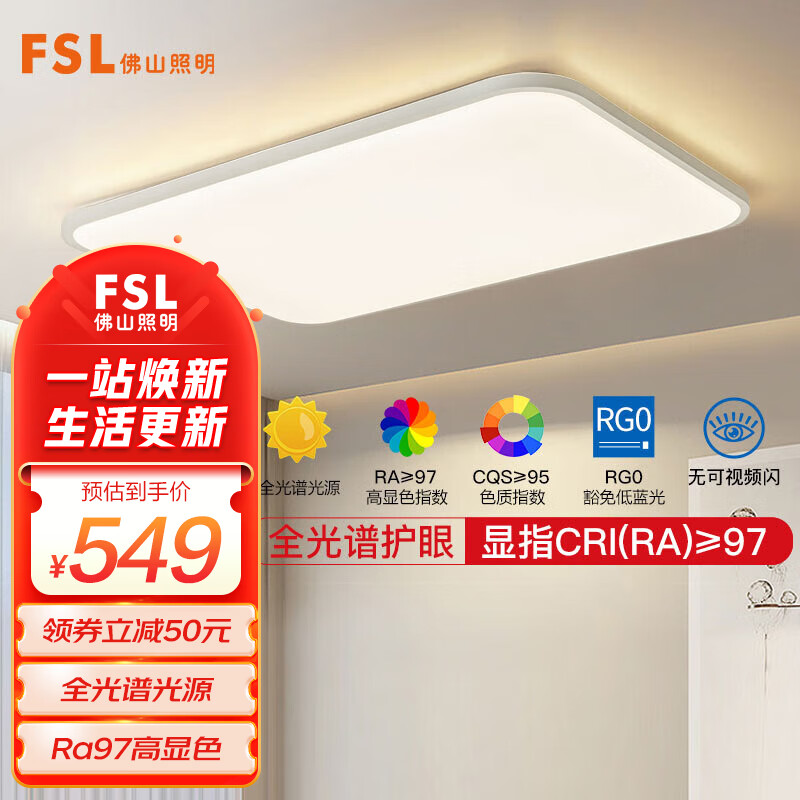 FSL佛山照明吸顶灯LED客厅灯高显97灯具简约三防遥控调色120W乘风价格:599.00元!