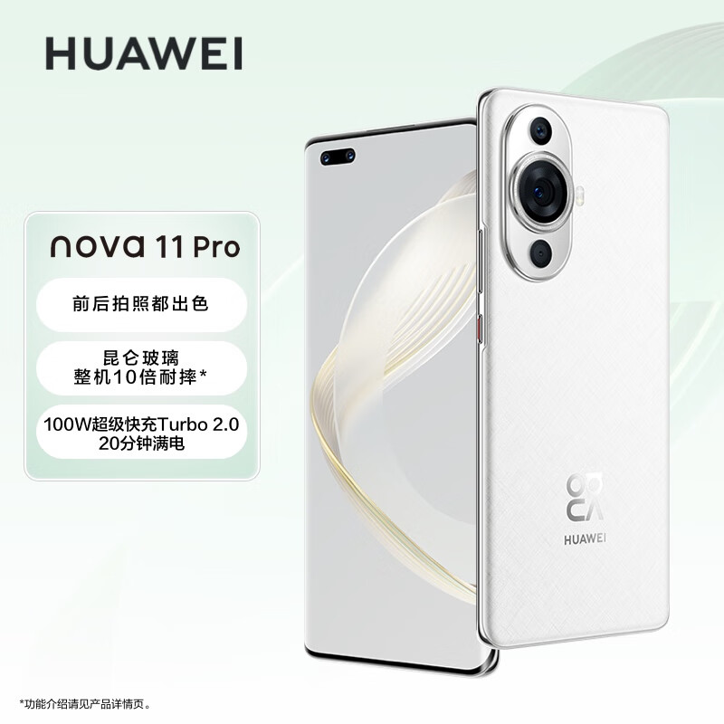 HUAWEI nova 11 Pro 超可靠昆仑玻璃 前置6000万人像双摄 256GB 雪域白 华为鸿蒙智能手机价格:3649.00元!