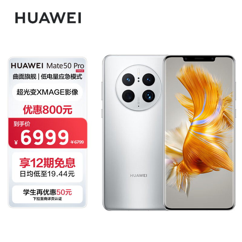 HUAWEI Mate 50 Pro 曲面旗舰 超光变XMAGE影像 北斗卫星消息 512GB 冰霜银 华为鸿蒙手机价格:6999.00元!