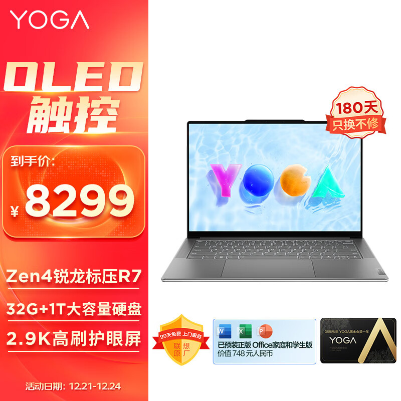 联想笔记本电脑YOGA Air14s轻薄本 14.5英寸商务本(全新高性能R7-7840s 32GB 1T 2.9K OLED 90Hz)水月银价格:8299.00元!