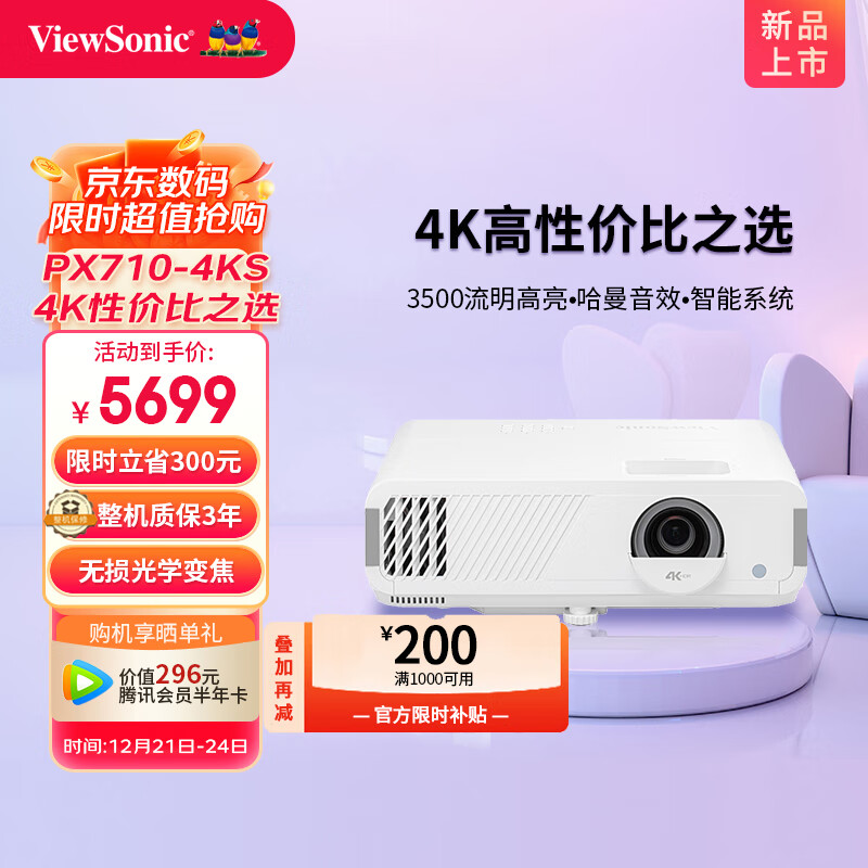 优派 PX710-4KS 投影仪家用 智能投影机 游戏电竞(4K超高清 240Hz刷新率 3500流明 光学无损变焦 哈曼音效)价格:5999.00元!