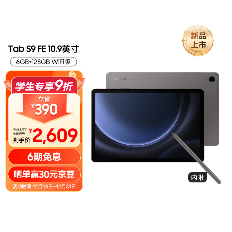 三星平板电脑2023款TabS9 FE 10.9英寸6+128GB[学生专享版]WIFI版护眼高清IP68防水含Spen石墨灰价格:2899.00元!