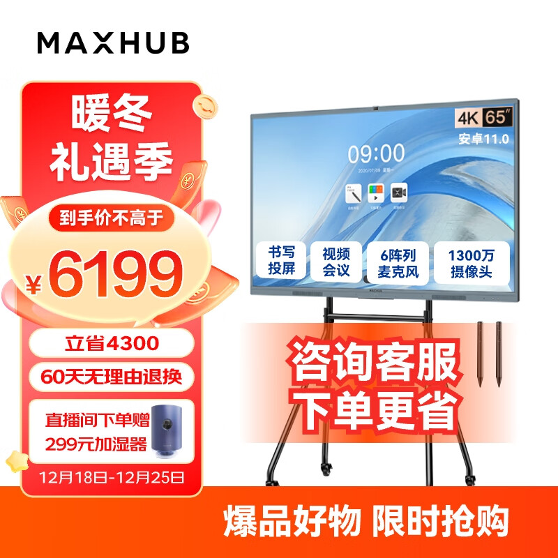 MAXHUB视频会议平板教学一体机触屏书写无线投屏内置会议摄像头麦克风V6新锐E65+时尚支架价格:6199.00元!