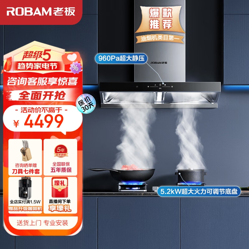 老板(Robam)抽油烟机 领航家D1S欧式22m3/min双腔聪明变频吸油烟机燃气灶家用烟灶套装60D1S+57B6D天然气价格:4499.00元!