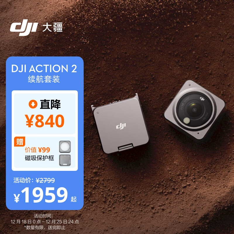 大疆 DJI Action 2 续航套装 灵眸小型手持防水防抖vlog相机 骑行摄像机便携式+随心换 1 年版+128G 内存卡价格:2222.90元!