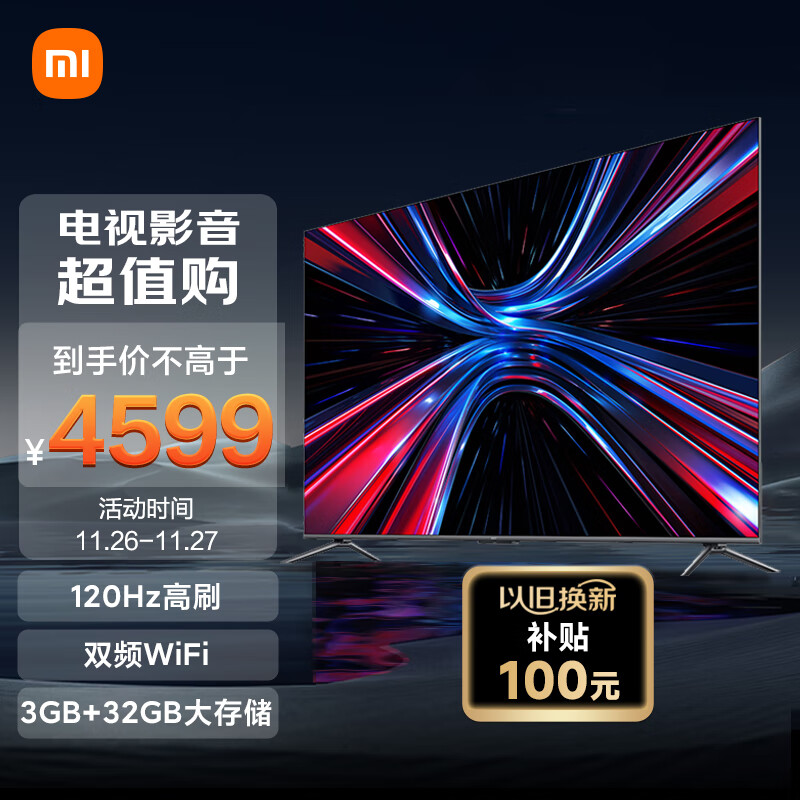 小米电视 Redmi X 85英寸 3+32GB大存储 120Hz高刷 4K屏 液晶智能平板75英寸+电视机L85RA-RX价格:4599.00元!