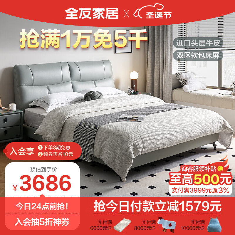全友家居 意式轻奢皮床卧室头层牛皮床屏双人1.8米皮床105201A价格:5265.00元!