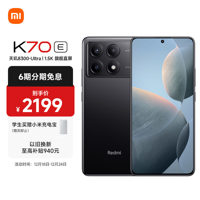 Redmi K70E 天玑 8300-Ultra 小米澎湃OS 1.5K 旗舰直屏 90W+5500mAh 12GB+512GB 墨羽 小米红米K70E 价格:2199.00元!