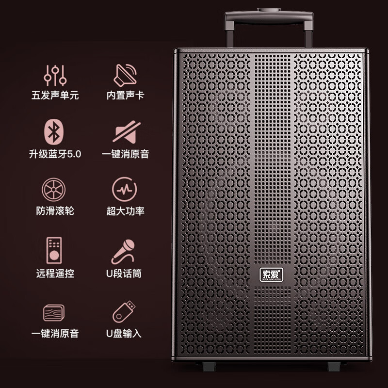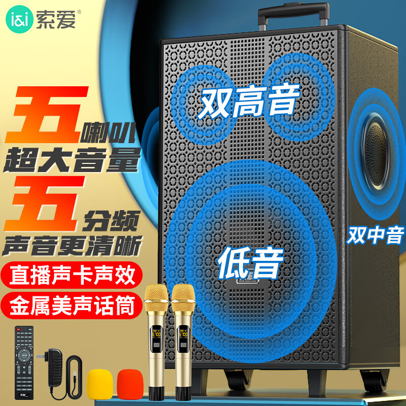索爱(soaiy)SA-K26 舞台级5喇叭大功率重低音广场舞音响网红直播移动户外蓝牙拉杆音箱带无线声卡话筒价格:2999.00元!