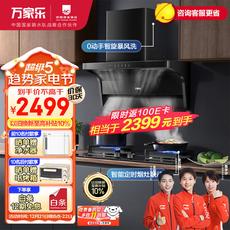 万家乐 抽油烟机 顶侧双吸油烟机 智能定时烟灶联动套装23m3/min抽油烟机5.0kW燃气灶套装AK6+AY9液化气价格:2599.00元!