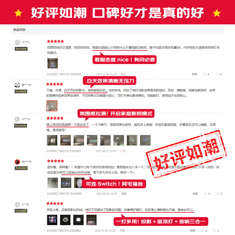 5、科技改变生活!神灯效果相当不错,三合一的神灯节省空间,使用方便,投影效果比较清晰,音质不错,有颜值,双十一活动入,性价比还是挺不错的!推荐购买!
